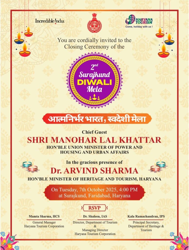 हरियाणा पर्यटन निगम द्वारा आयोजित किया जा रहा द्वितीय सूरजकुंड दीपावली मेले का मंगलवार 7 अक्टूबर को दोपहर बाद शाम : 04:00 बजे भव्य समापन समारोह के साथ समापन होगा। समापन समारोह में केंद्रीय विद्युत एवं आवास तथा शहरी कार्य मंत्री मनोहर लाल मुख्य अतिथि होंगे। समापन समारोह की अध्यक्षता हरियाणा सरकार में पर्यटन एवं धरोहर मंत्री डॉ. अरविंद शर्मा करेंगे। दीपावली मेला के समापन समारोह में हरियाणा के पर्यटन एवं धरोहर विभाग की प्रधान सचिव कला रामचंद्रन, निदेशक डा. शालीन, हरियाणा पर्यटन निगम की महाप्रबंधक ममता शर्मा सहित विभिन्न विभागों के वरिष्ठ अधिकारी, कारीगर, कलाकार व आगंतुक उपस्थित रहेंगे।