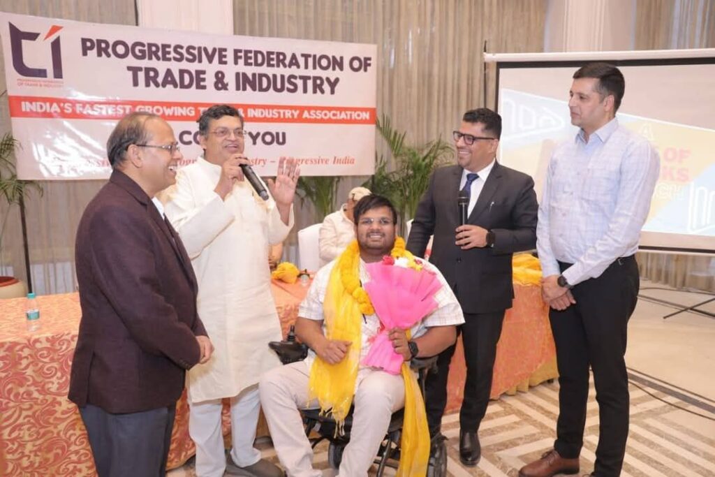 प्रोग्रेसिव फेडरेशन ऑफ ट्रेड एंड इंडस्ट्रीज अध्यक्ष दीपक मैनी जी सेक्रेट्री श्री एस पी अग्रवाल जी और सभी व्यापारियों एवं श्री गोपाल कृष्ण अग्रवाल राष्ट्रीय स्पोक्सपर्सन ऑफ भारतीय जनता पार्टी इकोनॉमिक्स अफेयर्स और सम्मानित व्यापारियों द्वारा अंतराष्ट्रीय पैरा एथलीट एवं राष्ट्रीय राइफल शूटर देवर्षि सचान को अंतराष्ट्रीय ,राष्ट्रीय और खेलो इंडिया 2025 में पदक जीतने और एक बेहतर मुकाम हासिल करने हेतु सम्मानित किया ।